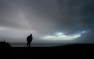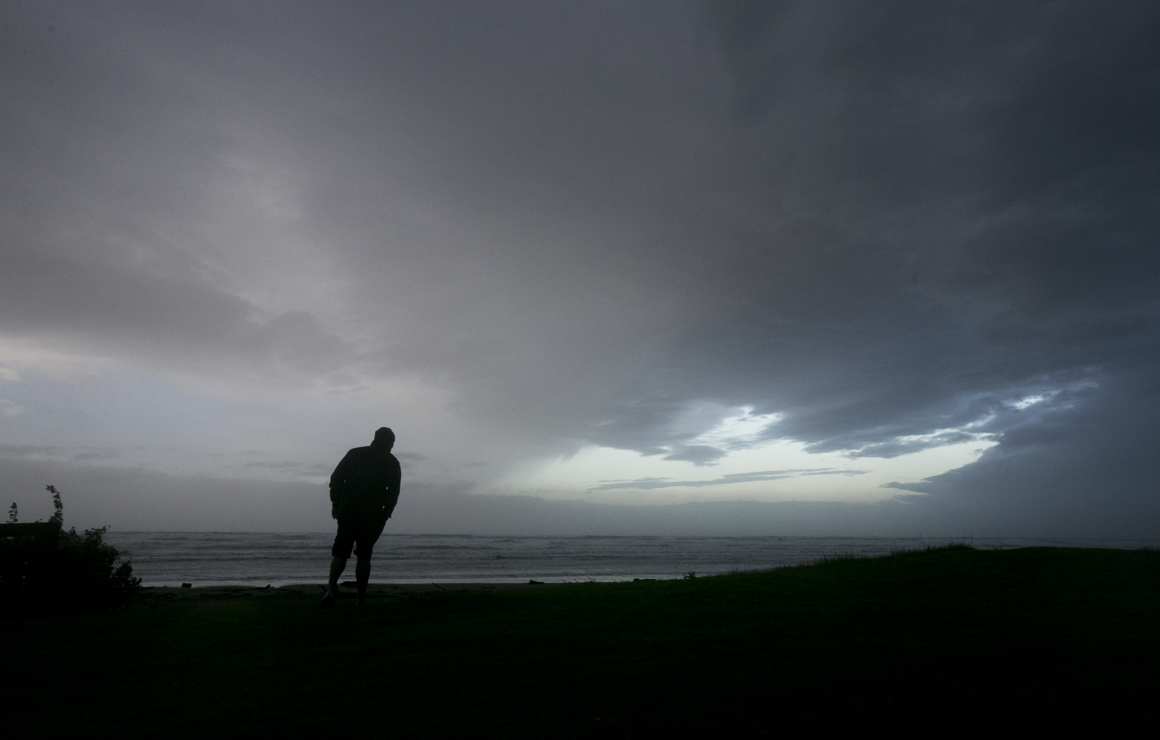 A resident of Ohope Beach leans into the strong wind as he looks out to sea watching the results of Cyclone Cook as it sweeps down the Bay of Plenty coastline.